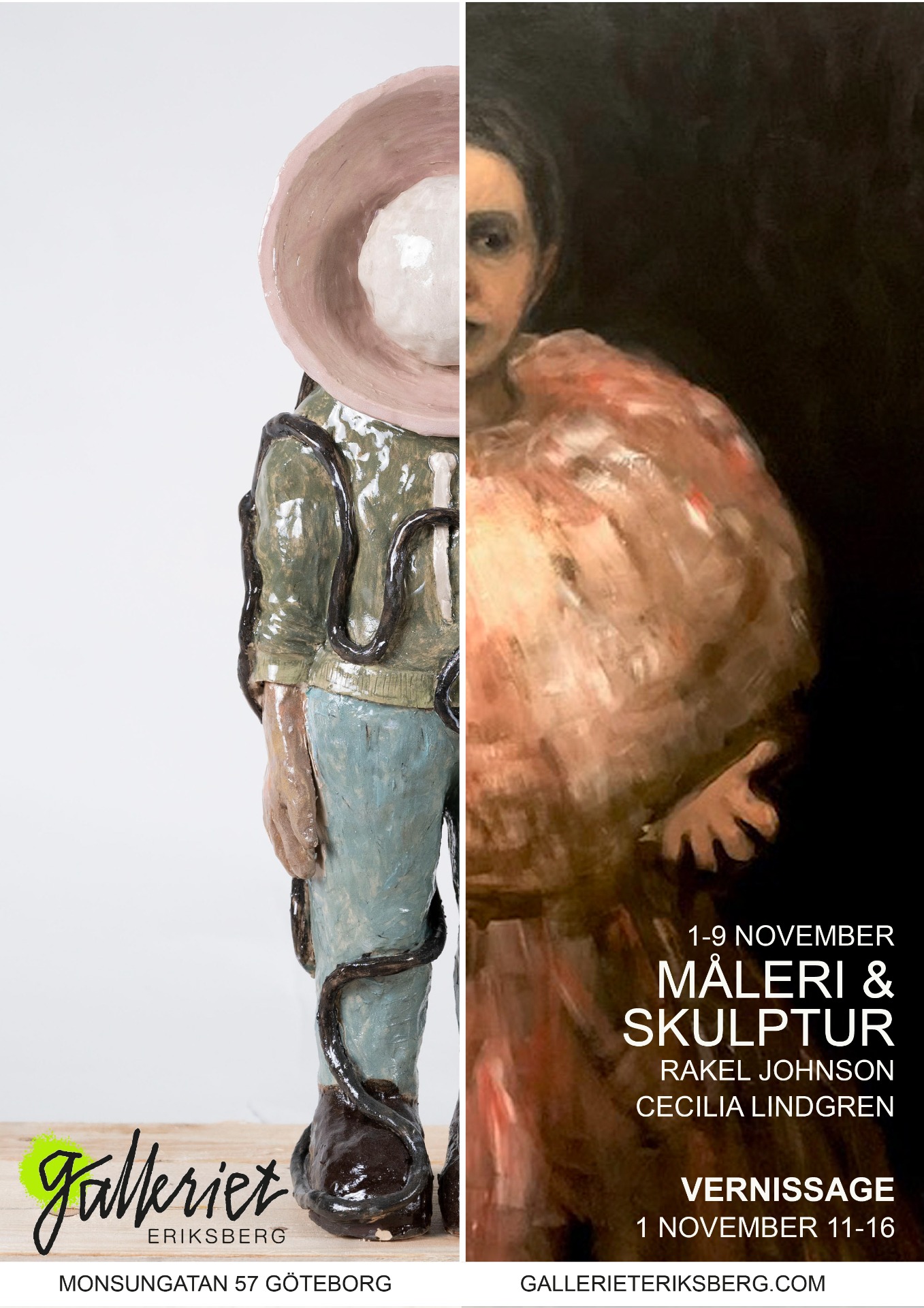 Rakel Johnsons måleri bär på en stilla dramatik –murriga toner, skimrande skuggor och porträtt som andas renässansens mystik. Vid hennes sida står Cecilia Lindgrens skulpturer – lekfulla, "quirky" och fyllda av humor och fantasi. Tillsammans bildar deras verk ett samtal mellan tyngd och lätthet, mörker och ljus, allvar och lek. En suggestiv helhet där kontraster möts och speglar varandra, och där betraktaren bjuds in att dröja, reflektera och låta sig beröras.