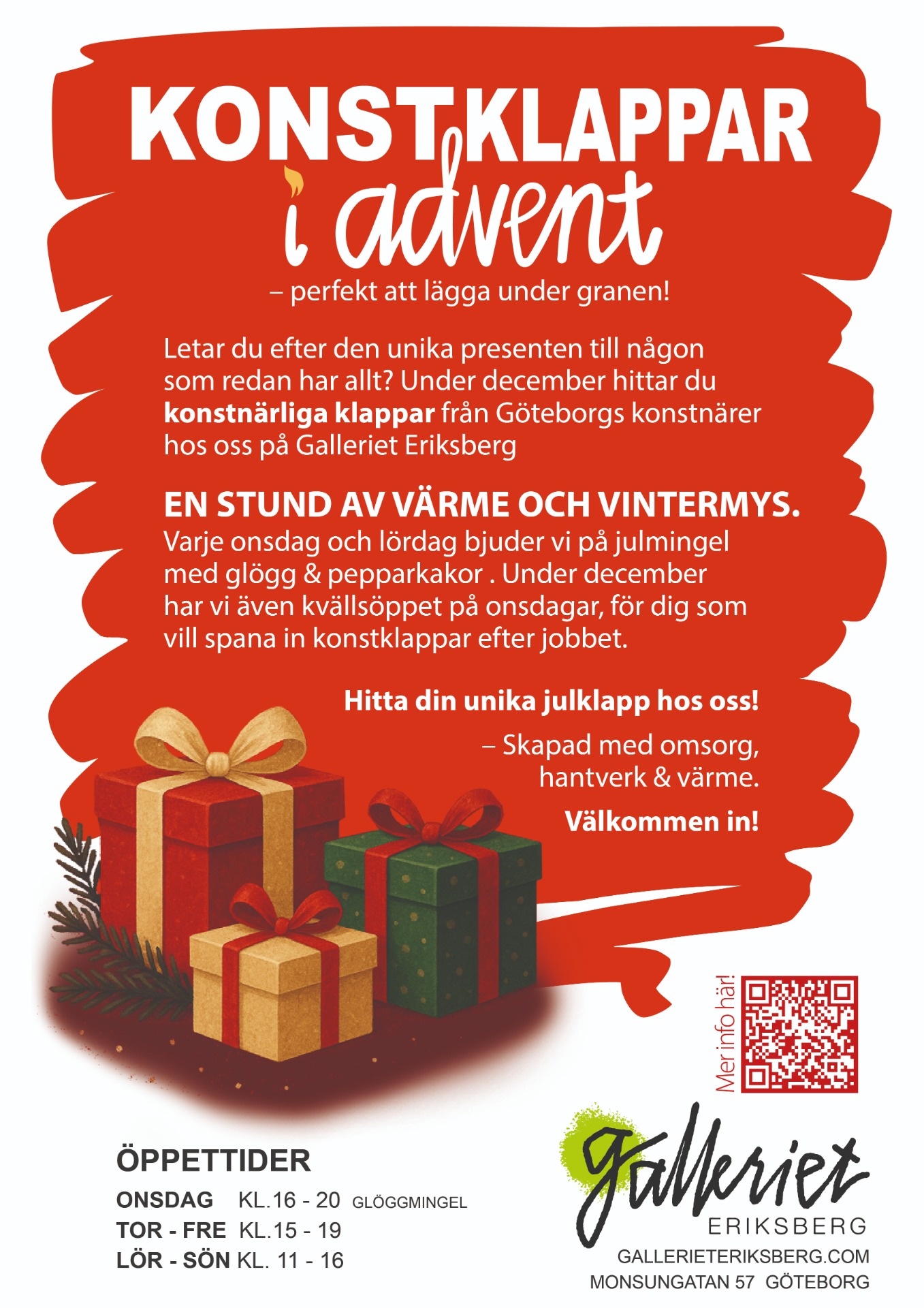 Hos oss kan du mingla, smaka glögg och samtala om färg, form och skapande i galleriet – och kanske upptäcka den där unika julklappen till någon som redan har allt.
