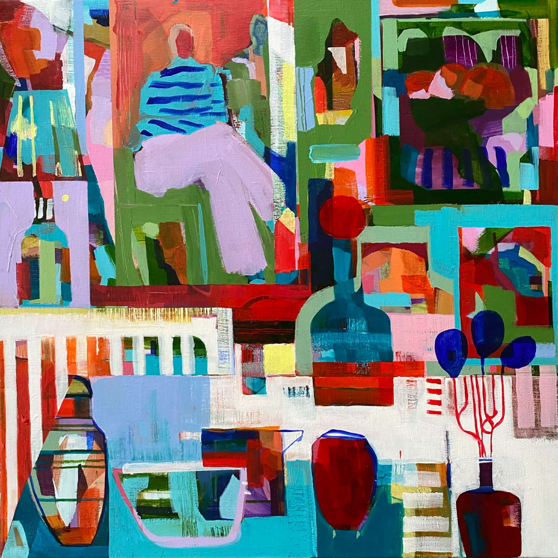 I andra målningar blir block av klara färger och tydliga former ett mer strukturerat och direkt uttryck. Här blir färgen en konkret byggsten, där kontraster och harmonier spelar mot varandra i ett rent visuellt språk.