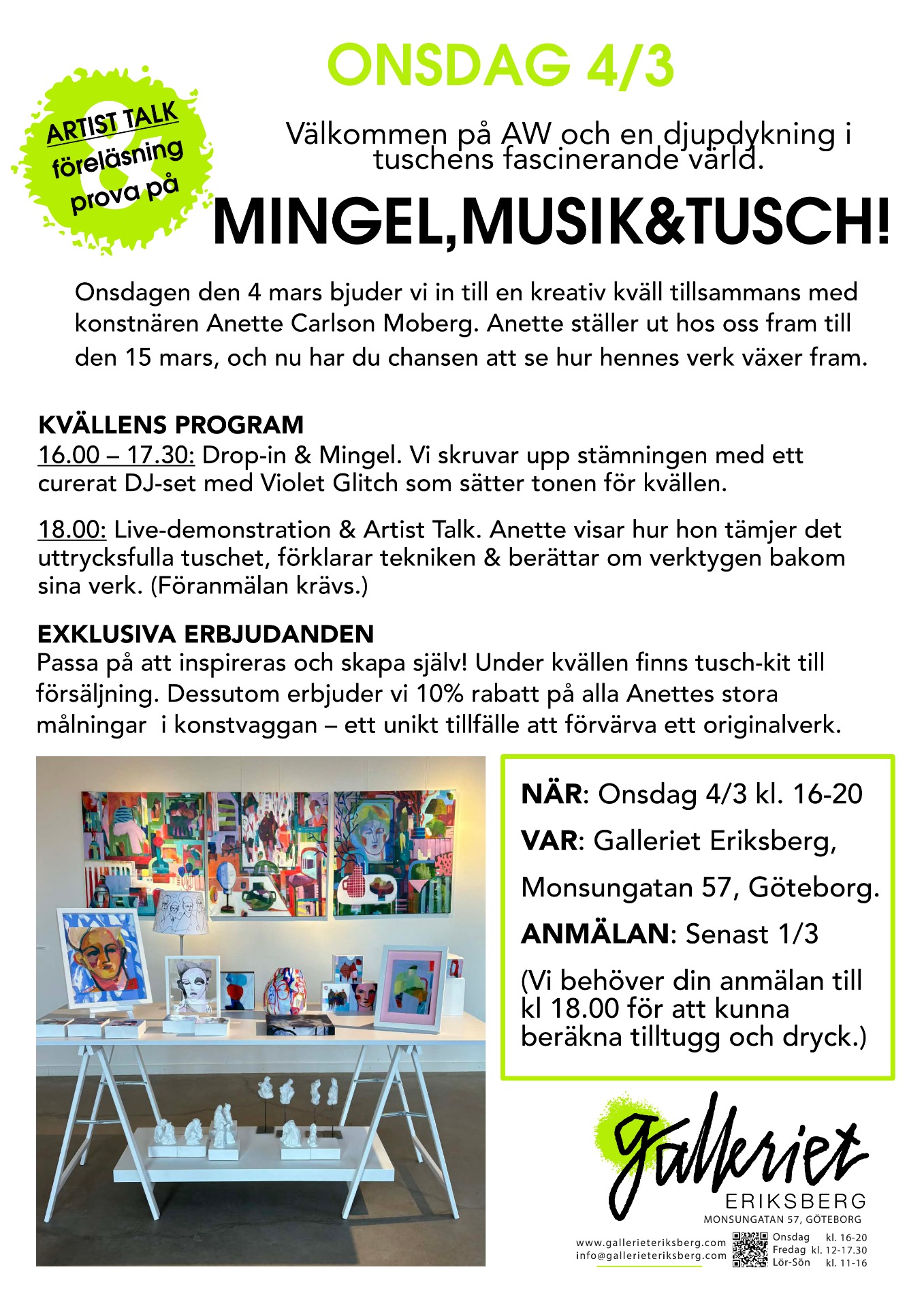 till info@gallerieteriksberg.com (Vi behöver din anmälan till kl 18.00 för att kunna beräkna tilltugg och dryck.)